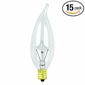 "MAINTENANCE PACK" DECORATIVE LIGHT BULB Bent (flame) tip incandescent bulb Chandelier Bulbs Candelabra brass base Lamp Life: 5600 hours 130 Volts 40 watts 15 bulbs per pack Clear Boxed